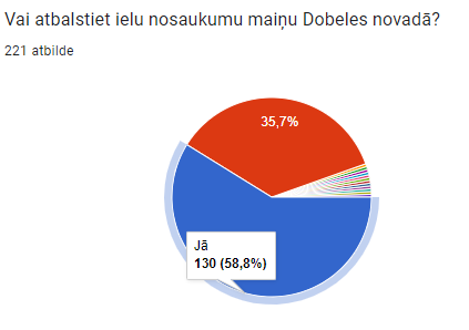 Digitālo anketu aizpildīja 221 respondents, un rezultāti izrādījās nevienozīmīgi – 58,8% atbildēja, ka “jā “, 35, 7%, ka “nē” un 5,5% respondentu bija cits viedoklis. Pie citu viedokļa atbildes tika atstāti komentāri, kuri norādīja, ka piekrīt ielu nosaukumu maiņai tikai tādā gadījumā, ja pašvaldība sedz visas ar nosaukumu maiņu saistītās izmaksas.