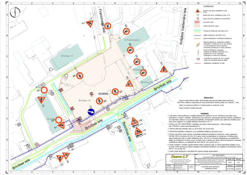 Būvdarbu laikā tiks slēgta daļa brauktuves, un satiksme Brīvības ielā tiks organizēta pa vienu joslu katrā virzienā.