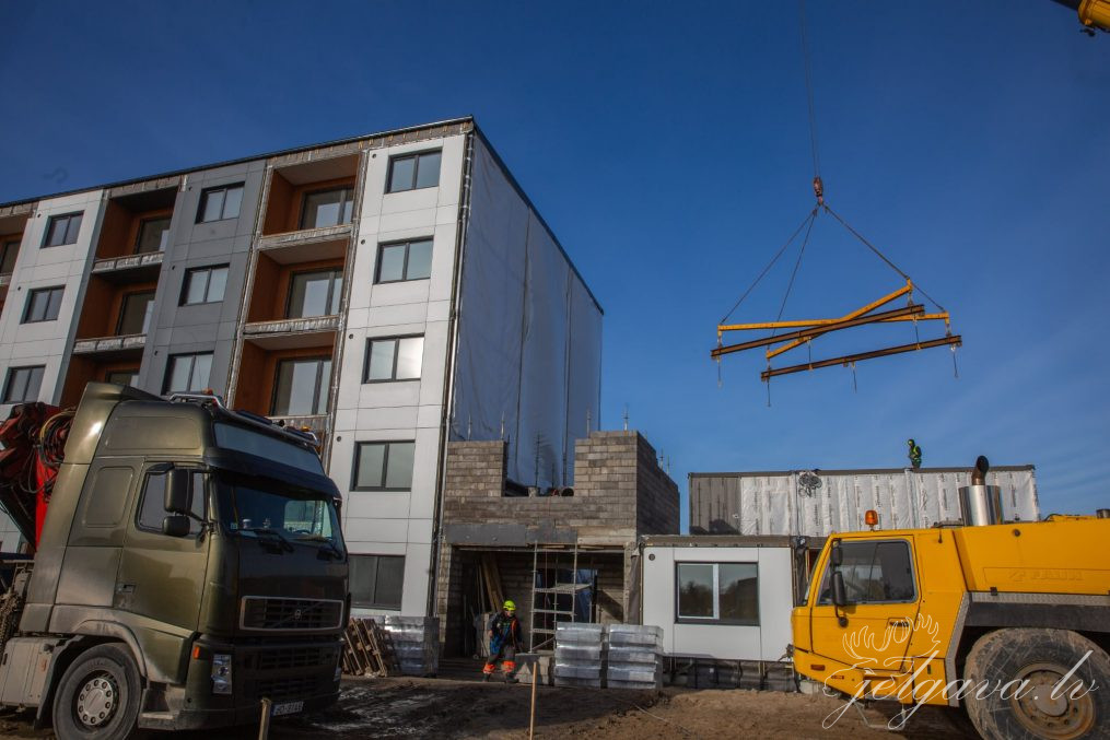 “Puse pirmās mājas, visi pieci stāvi, ir samontēta, un šajā daļā notiek iekšējo inženierkomunikāciju izbūve – ventilācijas, elektrības, stāvvadu, apkures, kuru plānojam drīzumā pieslēgt, lai varētu dzīvokļos sākt iekšējos apdares darbus. Pagājušajā nedēļā saņēmām modulārās konstrukcijas mājas otras puses 1. un 2. stāvam, kas jau uzstādītas, paralēli norit kāpņutelpas un gaiteņu izbūve. Plānojam, ka marta beigās tiks uzstādīts arī 3. un 4. stāvs, bet aprīlī – 5. stāvs un izbūvēts jumts. Tad varēsim ar lielāku jaudu ķerties klāt iekšdarbiem, lai jau vasarā šī māja būtu pabeigta un rudenī uzņemtu pirmos īrniekus,” stāsta SIA “Jelgavas īres nami” valdes loceklis Jānis Lagzdiņš.