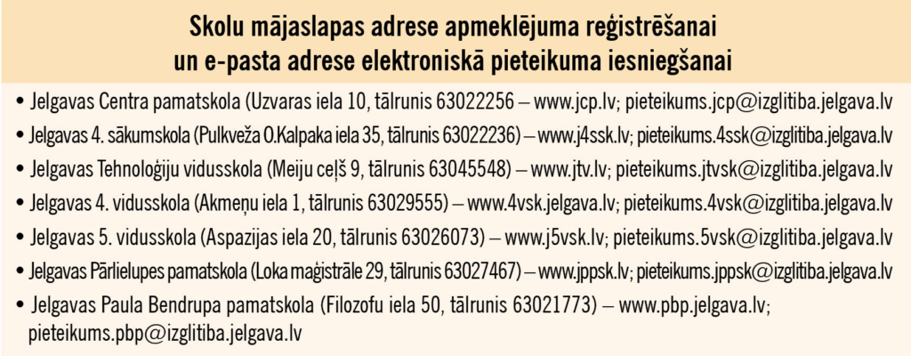 Piektdien, 1. martā, pulksten 8 sāksies bērnu reģistrācija 1. klasē 2024./2025. mācību gadam Jelgavas vispārizglītojošajās skolās. Vecāki reģistrāciju aicināti veikt elektroniski, bet, ja vēlas to darīt klātienē, skolas mājaslapā obligāti jāpiesakās izglītības iestādes apmeklējumam, informē pašvaldība.