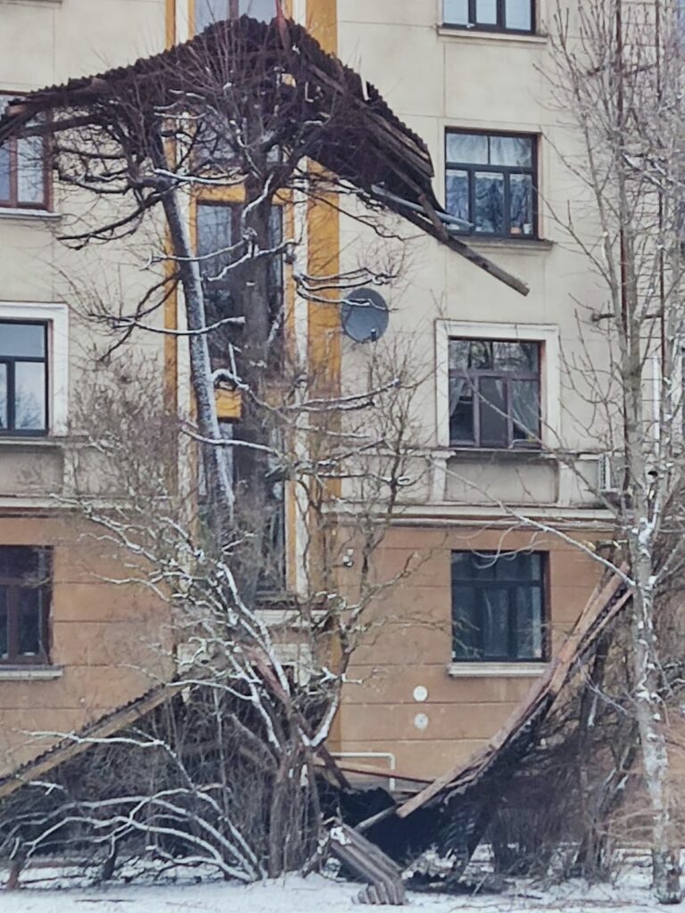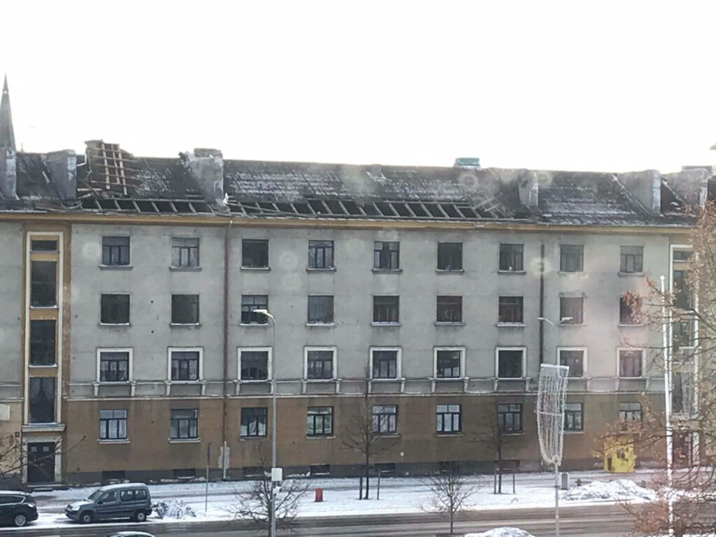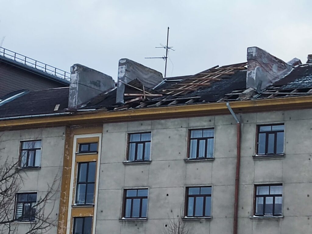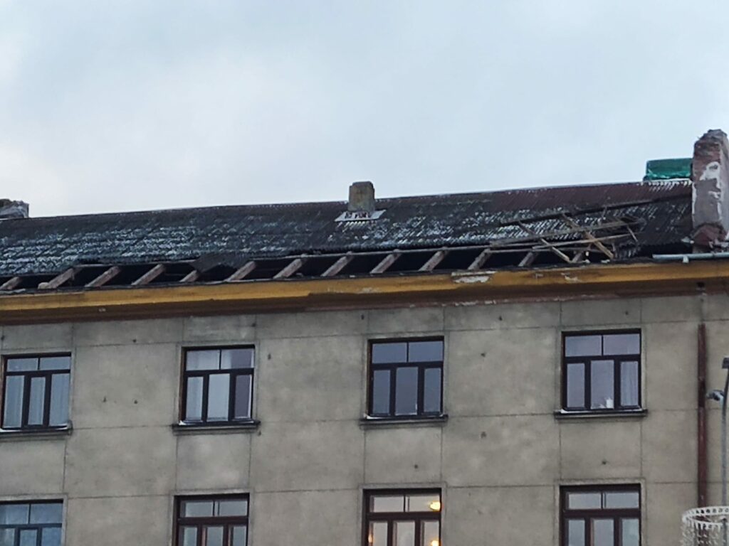 Turpinoties brāzmainajam vējam, pirmdien pusdienlaikā mājai Lielajā ielā 5 daļēji tika noplēsts jumts. Vēja nestās jumta konstrukcijas nosēdās mājas kokos un arī nokrita iekšpagalmā. Negadījumā neviens nav cietis.