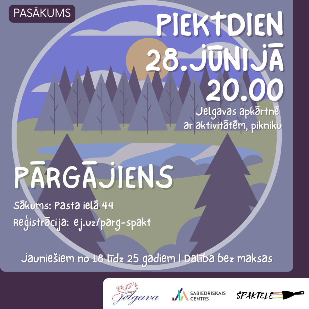 Jauniešu centrs “Špaktele” 28. jūnijā pulksten 20 aicina jauniešus no 18 līdz 25 gadiem piedalīties saliedējošā un izzinošā pārgājienā pa Jelgavas apkārtni. Dalība pasākumā ir bez maksas, informē “Špaktele”.
