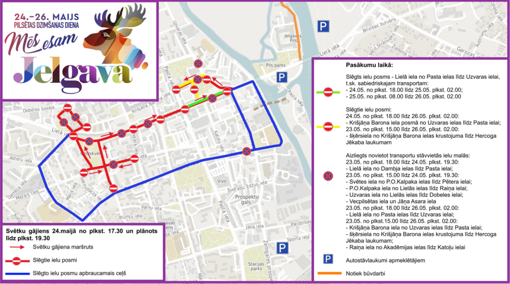 • No ceturtdienas, 23. maija, pulksten 15 līdz piektdienas, 24. maija, pulksten 19.30 – Svētes ielā no Pulkveža Oskara Kalpaka ielas līdz Pētera ielai; Pulkveža Oskara Kalpaka ielā no Lielās ielas līdz Raiņa ielai; Uzvaras ielā no Lielās ielas līdz Dobeles ielai Vecpilsētas ielā un Jāņa Asara ielā.