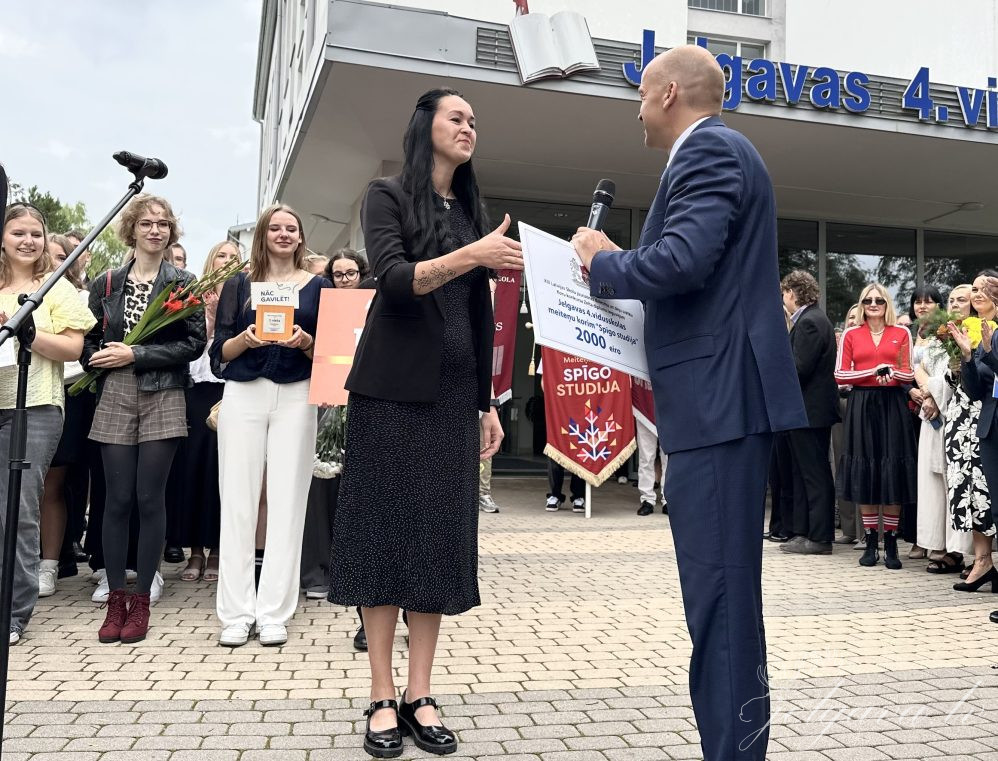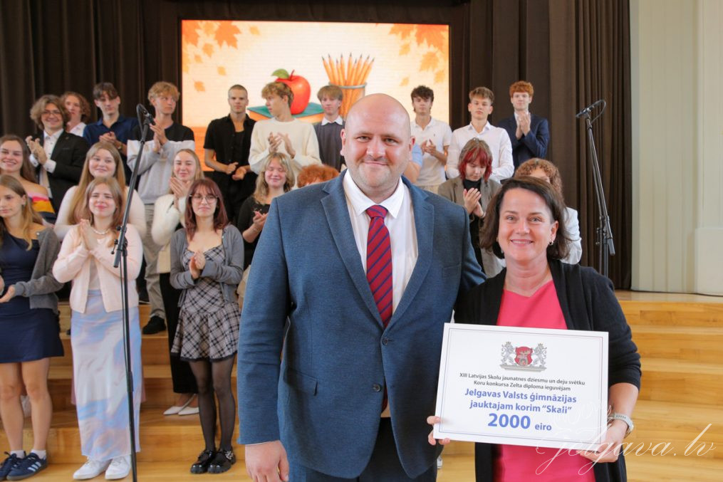 2000 eiro piešķirts arī Zelta diploma ieguvējam – Jelgavas Valsts ģimnāzijas jauktajam korim “Skali”. Naudas balvu korim pasniedza Jelgavas domes priekšsēdētājs Mārtiņš Daģis.