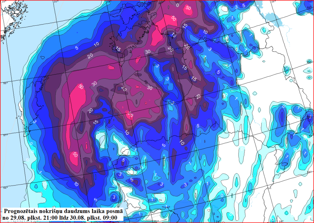 No Kurzemes lietusgāzes pakāpeniski nakts laikā izplatīsies arī citviet Latvijā, kā arī turpināsies rīt dienā, tomēr to intensitāte šobrīd tiek prognozēta mazāka nekā Kurzemē gaidāmajām lietusgāzēm šovakar un naktī uz otrdienu – sākotnējā informācija liecina, ka varētu tikt izplatīts oranžā līmeņa brīdinājums par ļoti stiprām lietusgāzēm.