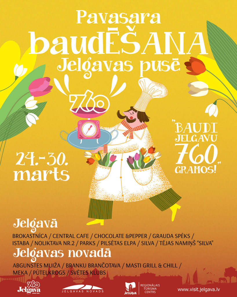 Jelgavas pilsēta šogad svin 760. dzimšanas dienu un ir tikai likumsakarīgi, ka arī pavasara “baudĒŠANA” būs veltīta Jelgavas jubilejai. Svinot pilsētas dzimšanas dienu radīts īpašs piedāvājums – “Baudi Jelgavu 760 gramos”, kurā katrs ēdināšanas uzņēmums piedāvās nobaudīt īstu garšas buķeti 760 gramos. Šī koncepcija nav tikai skaitlisks elements – tā būs kā simboliska saikne ar pilsētas vēsturi un tās attīstību cauri gadsimtiem. Katra akcijā iesaistītā vieta interpretēs šo ideju savā veidā – kāds izvēlējies atsauces uz Jelgavas kulināro mantojumu, cits piedāvās jaunradītas, radošas un modernas versijas, bet vēl kāds pārsteigs ar lokāliem produktiem un garšu kombinācijām. Viesi šajā nedēļā pie akcijas dalībniekiem varēs baudīt tādus ēdienu kā, piemēram, krēmīgu zandarta zupu ar dūmotu sviestu un sīpolu pelniem, skābpiena vaniļas krēmu ar karameļu mērci, bērzu sulas želeju ar grauzdētiem lazdu riekstiem, lēni gatavotu liellopa sautējumu sarkanvīnā ar dārzeņiem un kartupeļiem, košus augļu kokteiļus un daudzus citus gardumus.