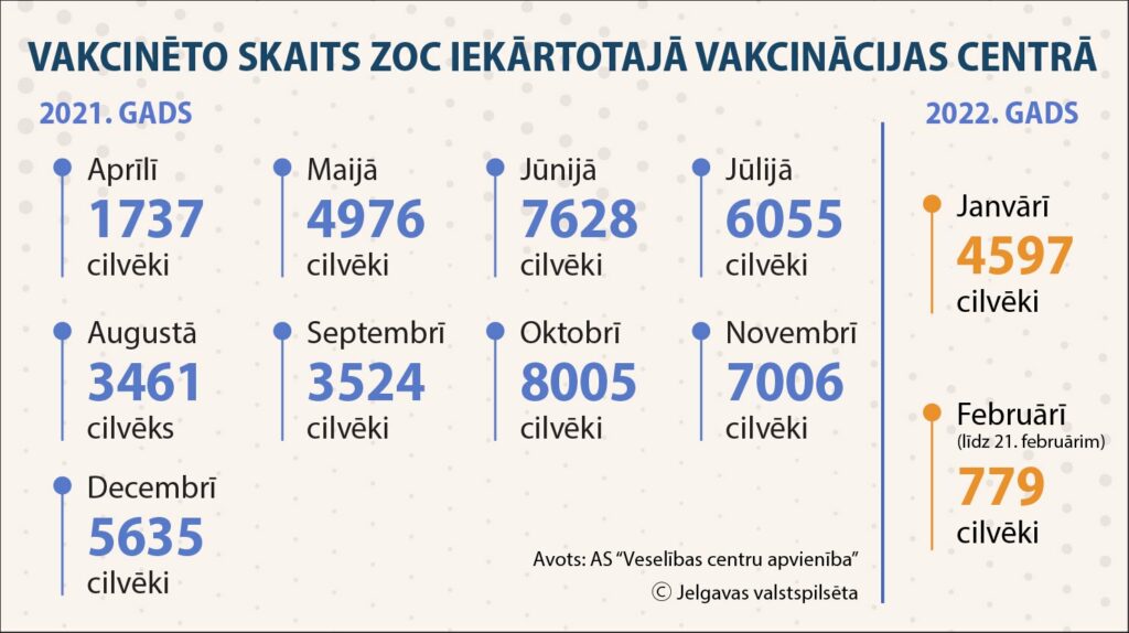 Vakcinācijas centrs ZOC strādāja no pagājušā gada aprīļa un šajā laikā kopumā vakcīnu pret Covid-19 saņēmuši aptuveni 54 000 iedzīvotāji. Visvairāk cilvēku ZOC tika vakcinēti oktobrī – 8005. SIA “Veselības centru apvienība” informē, ka nepilna gada laikā vakcinācijas centrā ZOC izlietotas aptuveni 35 000 “Pfizer” vakcīnas pret Covid-19, 10 000 – “Moderna”, 7000 – “Jansen” un 2000 – “Astra Zeneca”.