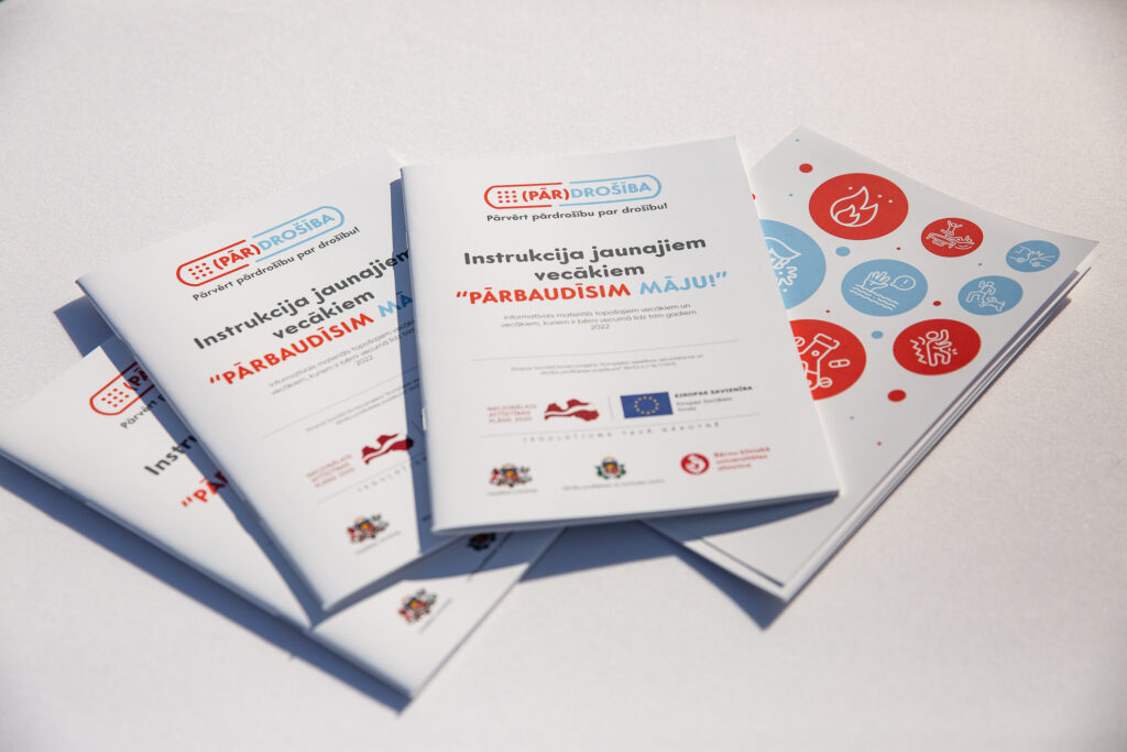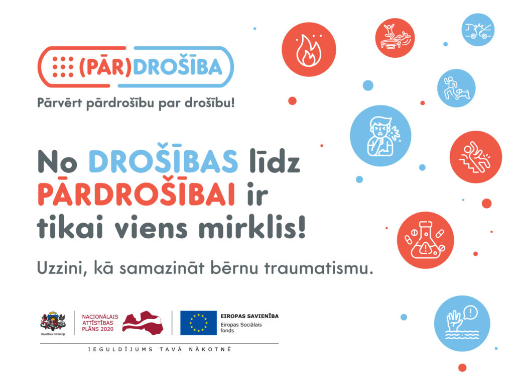 - ir sagatavoti un publicēti informatīvi materiāli – buklets (konspektīva informācija par traumatisma mazināšanu un pirmo palīdzību), instrukcija jaunajiem vecākiem (plašāka informācija par traumu novēršanu un palīdzības sniegšanu, ieteikumi bērnam droša mājokļa iekārtošanā) un videoklipi “Bērnam droša māja” un “Pārbaudīsim māju!”.