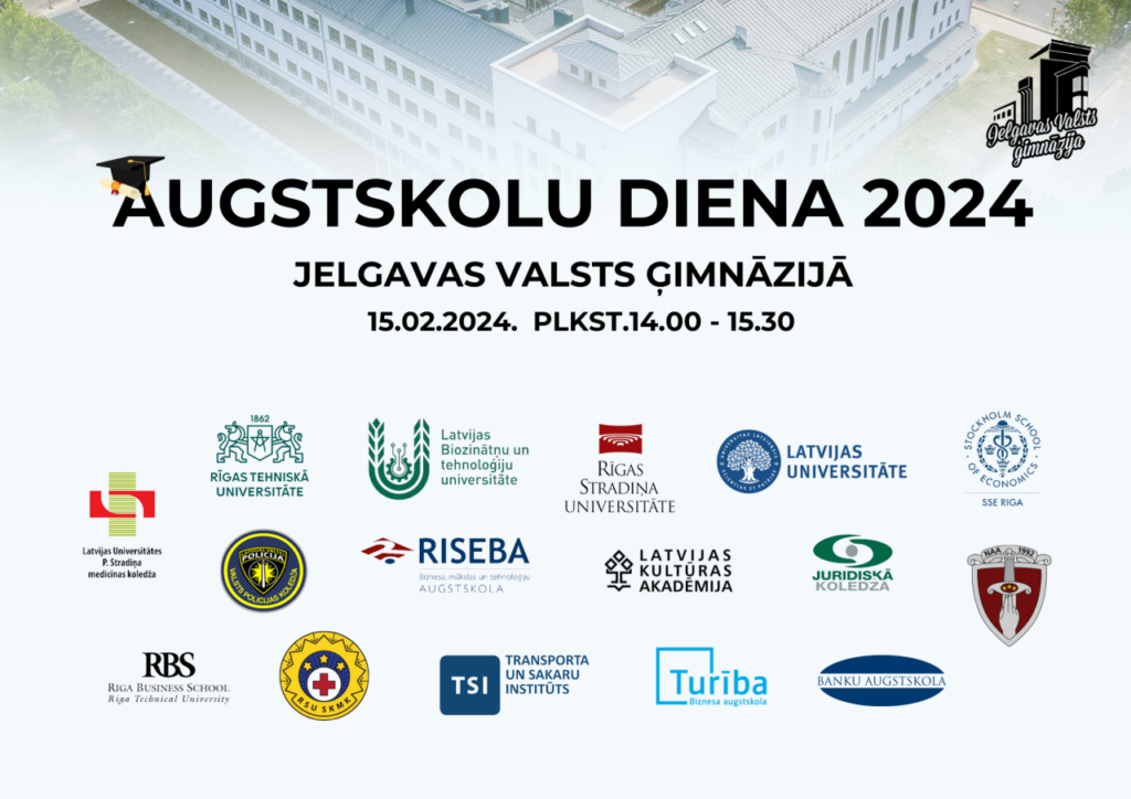 15. februārī no pulksten 14 līdz 15.30 Jelgavas Valsts ģimnāzijā norisināsies “Augstskolu diena 2024”, kurā tiek aicināti piedalīties visu Jelgavas skolu 11. un 12. klašu skolēni, informē Jelgavas Izglītības pārvalde.
