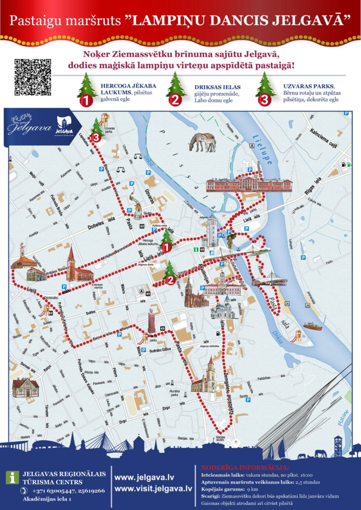 Tuvojoties Ziemassvētkiem un gadu mijai, Jelgavas pilsētas ielās, parkos un Hercoga Jēkaba laukumā iemirdzējušās tematiskās svētku lampiņu virtenes, dažādi gaismas dekori un grezni rotātās egles. Jelgavas reģionālais tūrisma centrs (JRTC), iekļaujot pilsētas izdekorētās vietas, izveidojis pastaigu maršrutu “Lampiņu dancis Jelgavā”, kas aicina iedzīvotājus un pilsētas viesus apskatīt Jelgavas svētku rotas un notvert Ziemassvētku brīnuma sajūtu.
