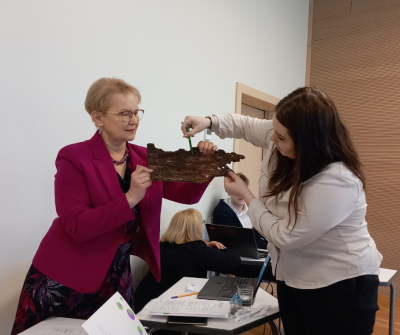 Beāte Šmuksta kopā ar darba konsultanti – pedagogu Inesi Didži pētnieciskā darba prezentācijā